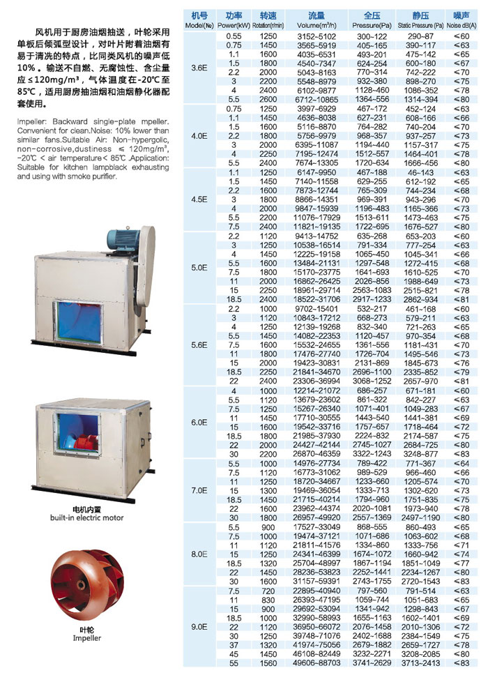 Impeller: Backward single-plate mpeller.Convenient for clean.Noise: 10% lower thansimilar fans.Suitable Air: Non-hypergolic,non- corrosive ,dustiness < 120mg/m',-20C < air temperature< 85C .Application:Suitable for kitchen lampblack exhaustingand using with smoke purifier.