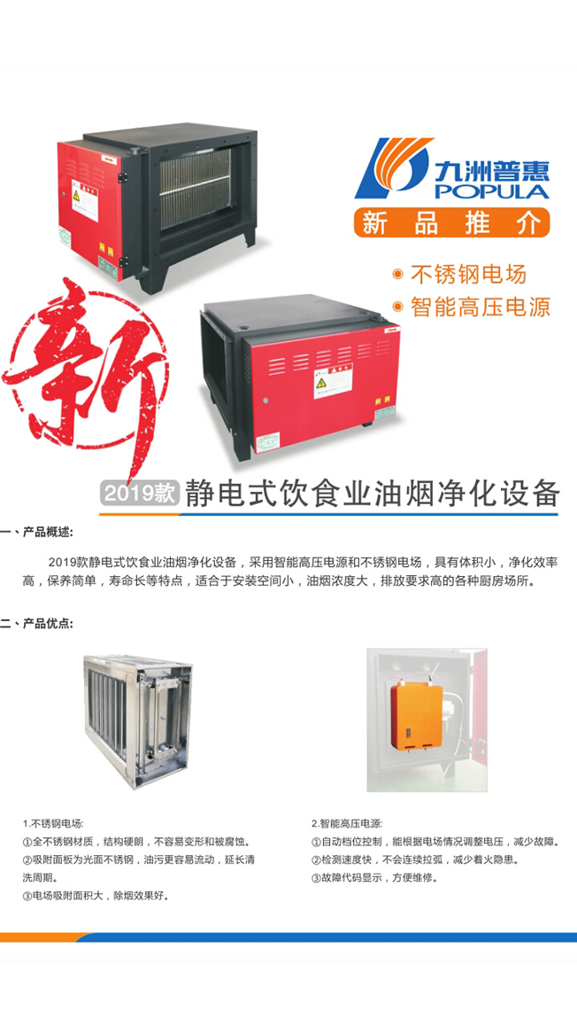 油煙凈化器是去除廚房油煙的專用設(shè)備。廣泛應(yīng)用于賓館、飯店、食堂等廚房油煙凈化。靜電式油炬凈化器嚴禁用于